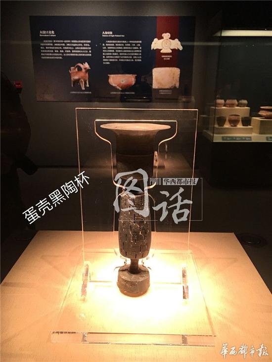 这些代表着史前先进生产力的陶器制作精美、造型古朴,件件都是精美绝伦的艺术品,直到今天仍然熠熠生辉。例如本次展览展出的国宝级文物蛋壳黑陶杯,考古学家形容其“黑如漆,亮如镜,薄如纸,硬如瓷”,器璧最薄处仅为0.2毫米,和金沙遗址出土的“太阳神鸟”金饰一样薄,代表了当时制陶工艺的最高水平。