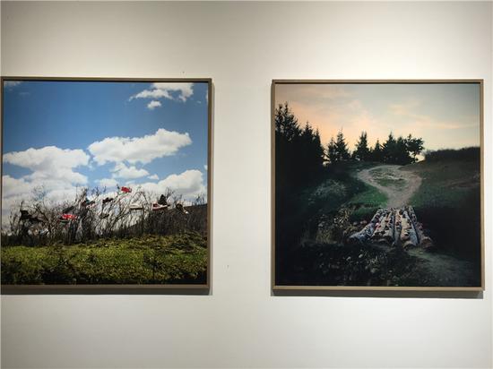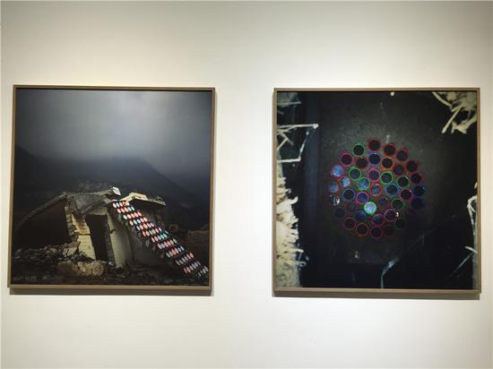 鞋子是沿着岷江一路收集的,韩五洲不知道为什么会有这么多鞋子,有可能是垃圾,有可能是漂流过来;后面一张是他自己的鞋子。“这个寨叫‘云上的民族’,来到这之后,云上的民族不在云上,而是在土地里,他们扎根于这片土地,而我们外人是在‘云上’,不管这片土地贫瘠与否,我们像云一样飘走,所以我把我的身份放进去,观众可能对此有一个对比的感觉。”