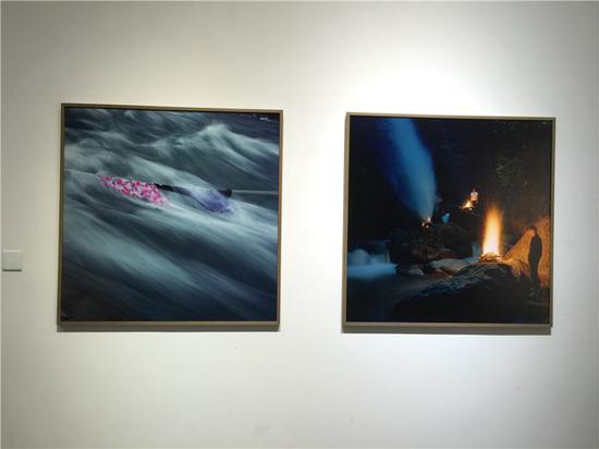 第三组,就是衣服放在岷江的水里击打,“我觉得不但是在岷江生活的人,生活在这个社会环境中的人也是这样一个状态,这是一个生存的体验。最后一张囊括的比较多,将人放在一个自然的环境,金木水火土五行里面有四行,从人的生存、时间和环境的关系来说是非常成立的,最终达到仪式上的宗教感。”