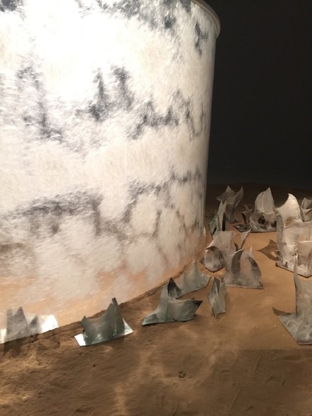 将自己喻为蚕的梁绍基的蚕丝装置作品《月庭》, 两条透明耐力板塑造出优美几何曲线,板上覆满薄薄的洁白蚕丝,柔和光线下,蚕丝形成阿拉伯文字“宁静”。蚕丝耐力板下的多哈细沙上,长出三十件约半米高的碎镜、匕首、弯刀,缠绕柔软秀丽的白色蚕丝… 整件作品在两年间历经五次养蚕,三万七千条蚕参与创作而成。