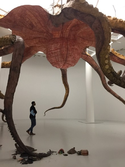 黄永砯的6吨重的巨大装置《乌贼》:一海洋巨兽悬挂倒置在展厅7.5米高天花板下,八根长约25米的腿脚在展厅内张牙舞爪, 吸盘分泌出墨汁,染黑瓶罐等海洋垃圾、死去的鸟和鱼。作品拥有的嚣张能量和幽默暗喻,在表现环境问题同时,反映了艺术家一贯的艺术态度和手法,以及对哲学、文化和政治的思考。