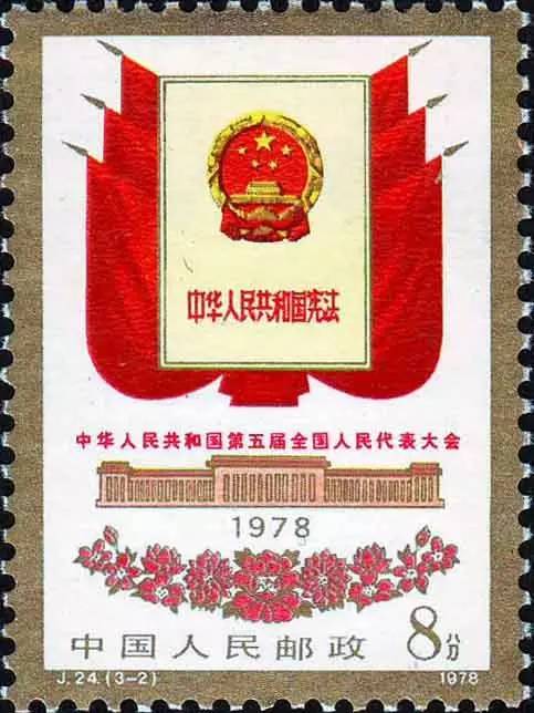 1978年2月26日发行一套3枚的纪念邮票(J.24),其中第二枚为“人民宪法”,图案为红旗掩映下的宪法文本、人民大会堂、鲜花等,由刘硕仁设计,采用影写版印刷。