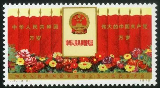 1975年1月25日,邮电部发行J.5《中华人民共和国第四届全国人民代表大会》邮票一套3枚,其中第2枚为“新宪法的诞生”。邮票由万维生、叶武林、邹建军、孙传哲等人设计,采用影写版印刷,图案为十面红旗和鲜花簇拥下的一部宪法。