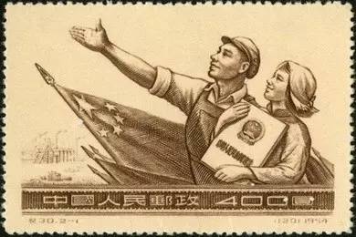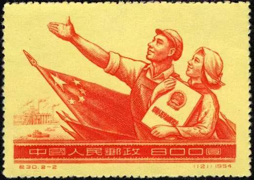 1954年12月30日,邮电部发行纪30《中华人民共和国宪法》邮票一套2枚,邵柏林设计,胶雕套印。两枚邮票图案相同,图案为五星红旗前导下的工人和农民,女农民手捧宪法。