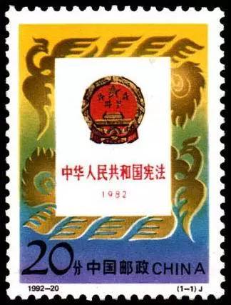 1992年12月4日,值现行宪法颁布十周年之际,我国发行一套编号为1992-20的《中华人民共和国宪法(1982—1992)》邮票,由卢天骄、潘可明设计,影写版印刷。画面为一对金色凤凰在广阔天地间由东向西,由西向东地围绕着宪法上下飞舞。凤凰是幸福、吉祥的象征,寓示着中国人民在中国共产党领导下,团结奋斗,创造出一个太平盛世,国家繁荣昌盛,人民安居乐业。