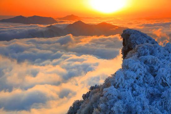 光雾山旅游区地处我国南北气候地理分界线上,是“南方的北方,北方的南方”,拥有独步天下的南国雾凇。形成雾凇需要两个必要条件:气温低、水汽足。每逢寒冬来临,空气中无数零度以下而尚未凝结的大量水蒸气随风在树枝上不断积聚冻粘,形成非冰非雪的雾凇奇观。光雾山雾凇品质之佳、形态之奇、面积之大,国内罕见。独特冬景,不是北国,胜似北国。欲观雾凇之奇,唯光雾山莫属。若于天朗气清之日,蓝天白云之下,以“仙境”概论尚显不足。