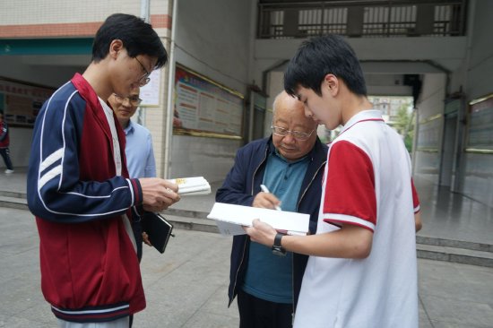 活动结束后,徐文耀教授与糜高峰书记合影留念,并为慕名而来的学生签名鼓励。(来源:渠县第二中学 薛华荣 蒲江 韩璐)