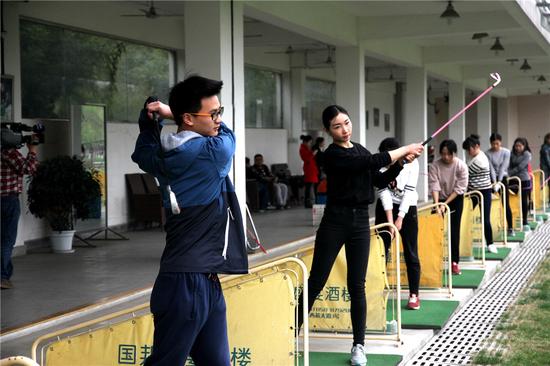 21日上午,电子科大成都学院大一学生冉红第一次拿起高尔夫球杆,她一直认为,高尔夫是一项贵族运动,“有钱人才玩得起的”,冉红说,“我也能打上高尔夫了,这种感觉很舒服。”