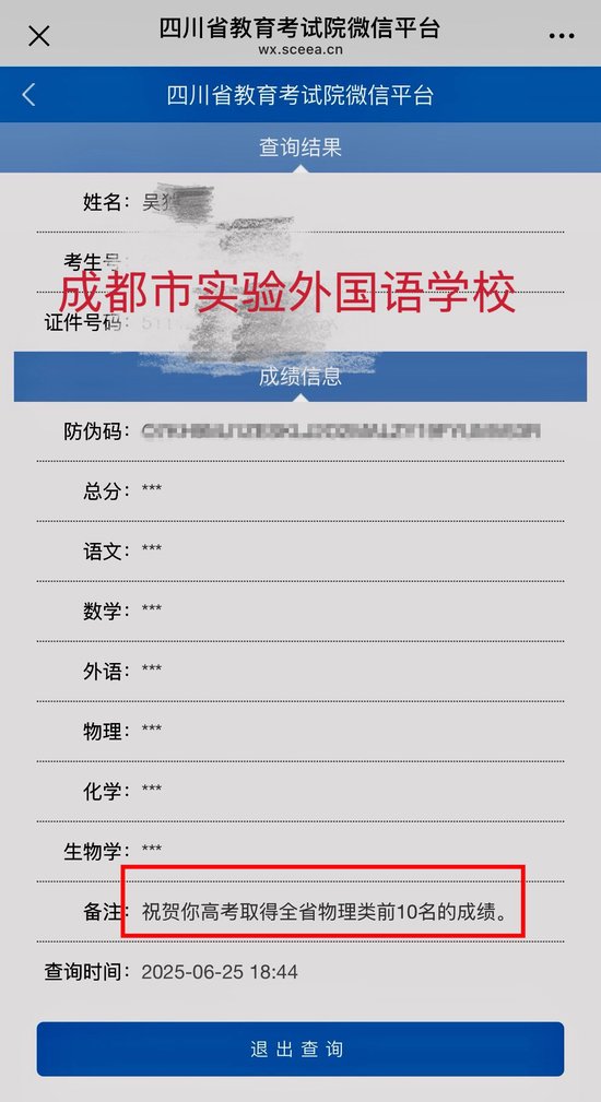 成都市实验外国语学校吴同学 高考四川省物理类前10名
