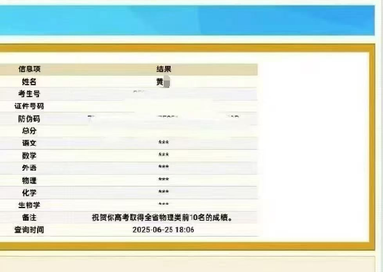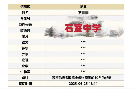石室中学北湖校区刘同学 高考四川省物理类前10名