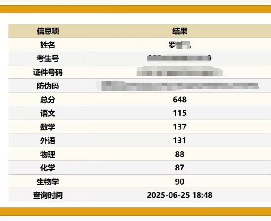 四川大学附属中学新城分校罗同学 高考物理类总分648分