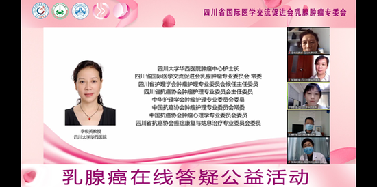 关注3月20日,四川省国际医学交流促进会乳腺肿瘤专委会联合四川省抗癌协会乳腺癌专委会、四川省预防医学会乳腺疾病预防与控制分会举办了第4场“爱不隔离·医乳既往”在线答疑公益活动。本次直播特别邀请乳腺癌领域多学科专家:四川大学华西医院罗婷教授、四川大学华西医院李俊英教授、电子科技大学附属肿瘤医院/四川省肿瘤医院王捷教授、绵阳市中心医院张晓红教授、四川大学华西医院张璋教授,为广大乳腺癌患者讲解了内科、外科、病理、放疗、护理多方面乳腺癌相关知识,并就如何科学合理治疗提供了建议。