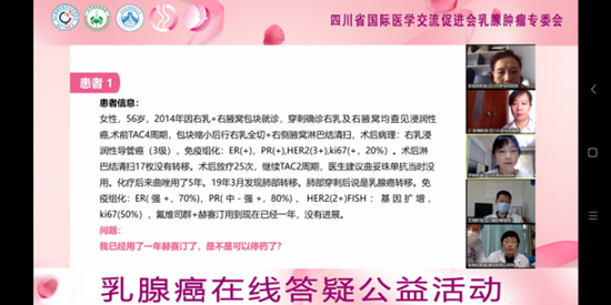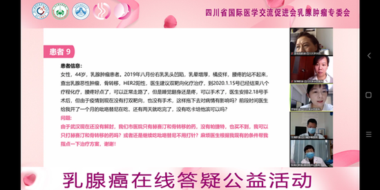 同时,五位专家对前期通过网络收集到的信息相对完整的9个病例进行了在线义诊,分析了乳腺癌治疗中面临的各种问题,并就患者提出的疑问在线实时解答,给出了专业的治疗建议。