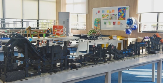 行至学习中心,恰逢学校举办“智能 智造 智在未来”迎新科创展,各式各样的VEX机器人摆满展台,引人注目。晏局长饶有兴致地走到VEX IQ智能智造生产线展台前,一边看展示,一边听讲解。VEX机器人作为学校三方课程,深受孩子们的喜爱,不仅助力落实“双减”,丰富校内课后服务,更立足长远,帮助孩子们了解人工智能在生活中的应用,培养孩子的主动探索精神和实践能力,实现多元素养共同发展。