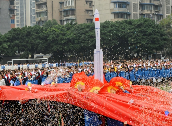 伴随着国歌声,五星红旗缓缓升起,全体师生肃立行注目礼,少先队员行队礼;伴随着校歌和同学们的歌声中,校旗和会旗升向天空。