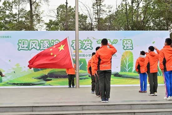 鲜红的五星红旗和朝阳一起冉冉升起,全体师生整齐肃立,庄严敬礼,面向国旗,高唱国歌,坚定的眼神中透露出砥砺前行的勇气。