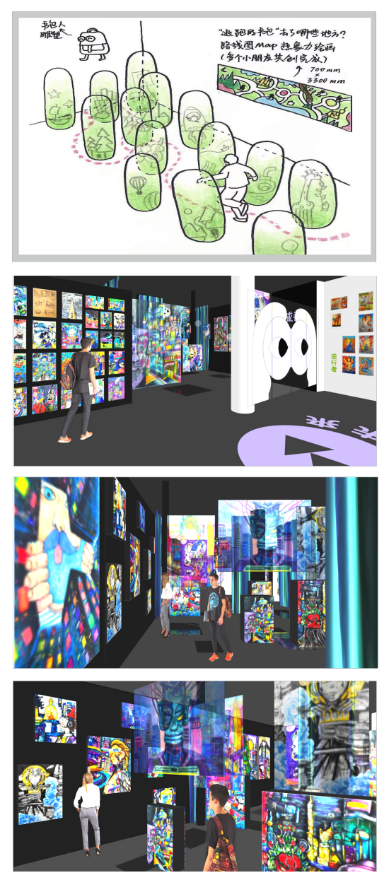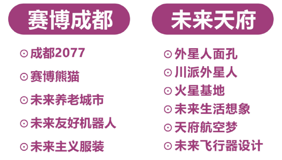在时间点为“未来”的展览板块“畅想未来”里,以小朋友对于未来成都风景的想象,在展厅里营造了一个光怪陆离的赛博成都场景;对外星人的好奇促使小朋友们用日常物品创造出一系列长相奇特的外星生物,又混搭着四川文化精髓造就了满墙的川派外星人;火星基地、未来飞行器、人类友好机器人这些会是什么模样,都可以在这里得到想象力爆棚的答案。