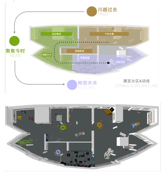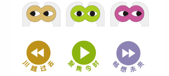 整个展览空间按时间线的顺序被分为《川越过去》《畅想未来》《聚焦今时》、三个区域,并以三组看往不同方向的大眼睛形象帘幕作为空间区隔的提示,倒带、播放、快进这三个图标不仅对应以上三个区域的时间概念,同时也作为观展动线的方向指引。