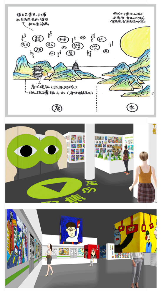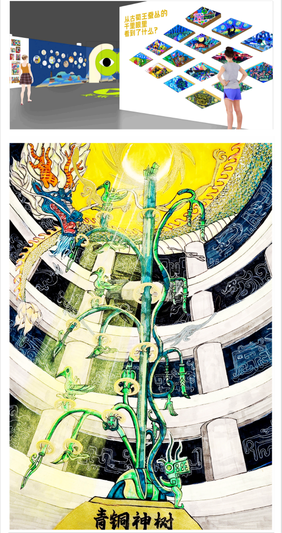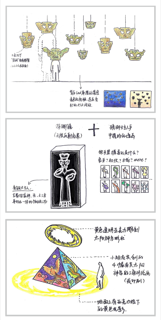 在时间点为“过去”的展览板块“川越过去”里,你可以在青铜立人形象的千层镜旁边看到小朋友们对于青大立人手握物最天马行空的猜想,在眼形画作中了解蚕从眼中古蜀世界的样貌,还可以穿梭于巨大的三国群雄扑克牌搭起的隧道,按太阳轮的方向环视气势向上的太阳神鸟装置案。