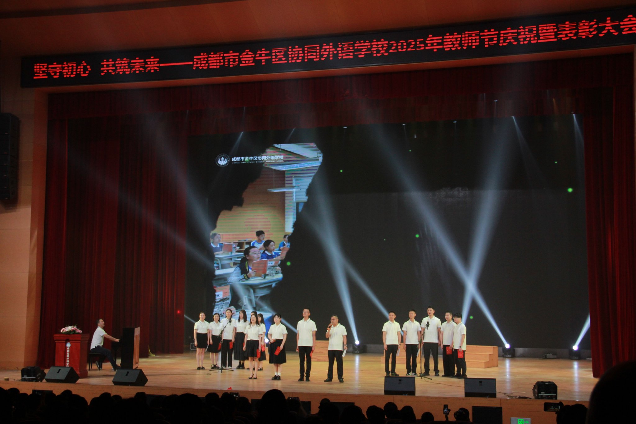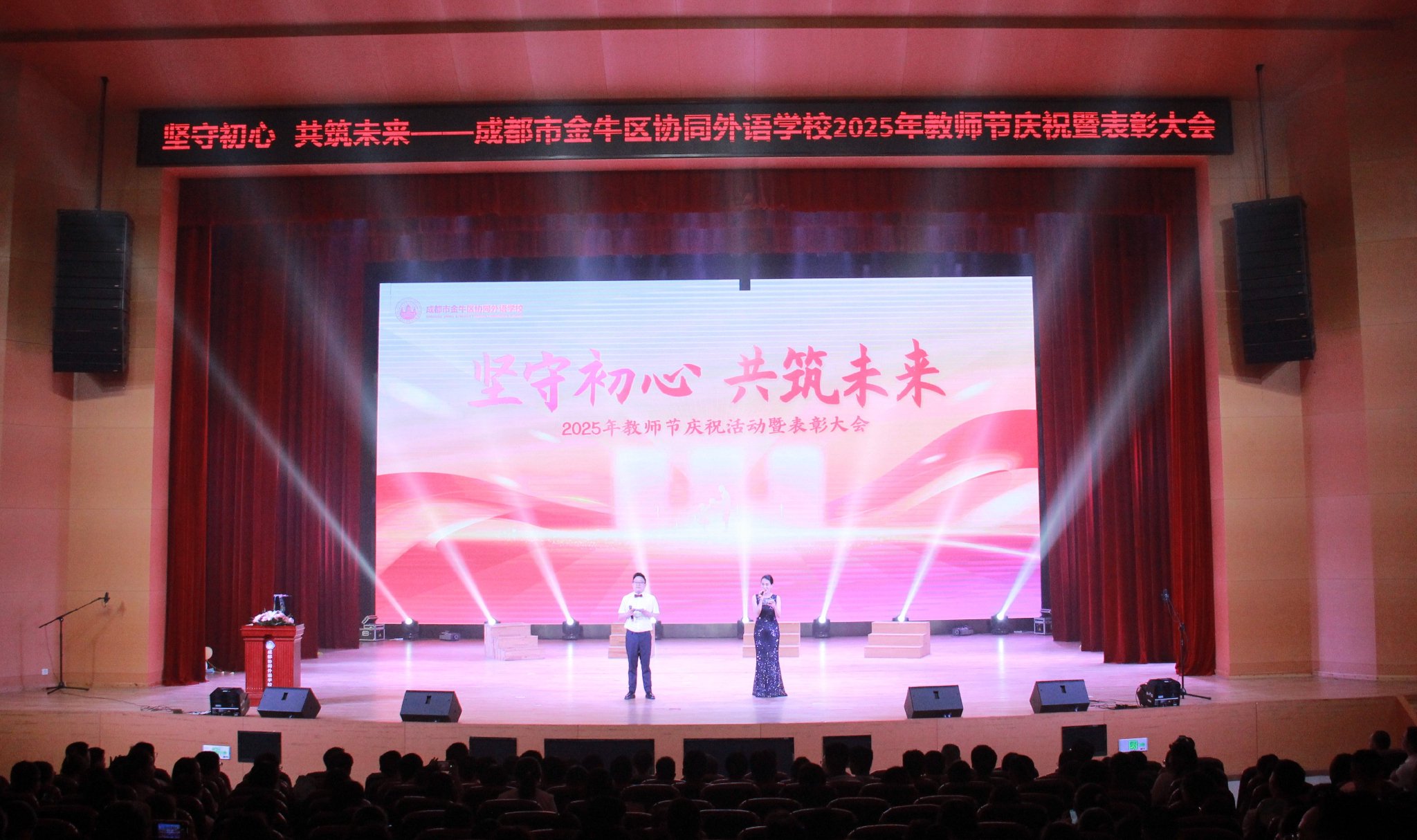 9月9日教师节前夕,成都市金牛区协同外语学校举行以“坚守初心 共筑未来”为主题的教师节表彰大会,全校教师和学生代表欢聚一堂,全体教职工欢聚一堂,表彰先进树榜样,凝聚初心担使命。