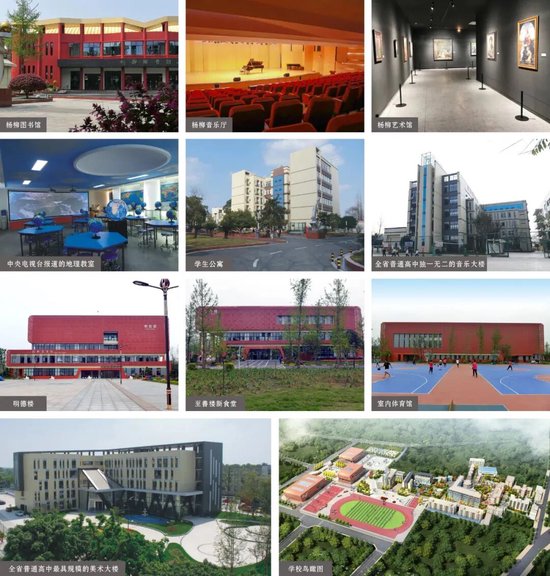 区委区政府高度重视学校发展,斥资3个多亿支持学校扩建,一期项目室内体育馆、学生食堂等已经投入使用,二期项目艺术中心和综合实验楼已经在建,将于2026年9月投入使用。杨柳图书馆、杨柳音乐厅、杨柳艺术馆、多媒体文化教室、多媒体美术画室、音乐琴房、舞蹈训练房、标准塑胶运动场、至善楼师生餐厅、学生空调公寓、六艺文化广场、喷泉广场等一应俱全。学校拥有全省普通高中面积最大的美术楼、功能齐全的音乐楼、设施先进的室内体育馆,助推学校艺术教育硬件全省领先,为艺体特色教育提供了强有力的硬件保障。