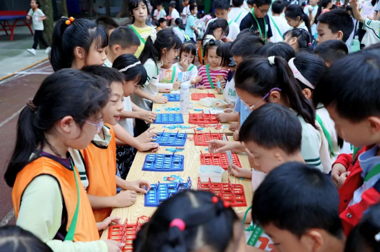 三年级摸盲盒猜图形、四年级玩五子棋、五年级挑战黑白棋、六年级解锁九连环……22个趣味项目,每个小龙娃都变身“数学小探险家”,一路闯关。一时间,校园成了超大数学游乐场,孩子们边玩边学,直呼:“数学太好玩啦!”