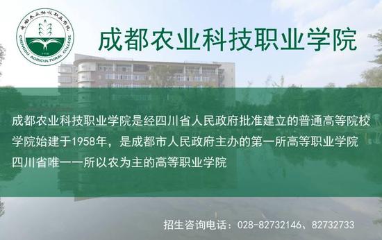 成都农业科技职业学院是经四川省人民政府批准建立的普通高等院校。学院始建于1958年,是成都市人民政府主办的第一所高等职业学院,也是四川省唯一一所以农为主的高等职业学院。