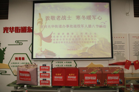 关注退役军人是党和国家的宝贵财富,是建设中国特色社会主义的重要力量。 1月10日,正值腊八佳节,中建新疆建工西南公司、四川分公司联合青羊区退役军人事务局、青羊区光华街道办事处在青羊区光华街道自主择业军转干部之家对青羊区部分退役军人开展了以“致敬老战士•寒冬暖军心”为主题的腊八节慰问活动。