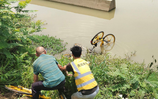 已经被打捞上来的美团单车被整齐的摆在路边,车身上的泥巴还未完全清理干净,工作人员一边整理一边表示:“这些车辆全部都比较新,经过简单检查龙头、坐垫、车架都有不同程度的损坏,需要拉回仓库进行全面的清理和检修。”在打捞的过程中,一些路过的市民都对把车丢弃在河道的行为表示不解,有市民表示:“共享单车是方便大家出行的,而不是用来丢弃的,看到这一幕真的是让人气愤。”还有市民认为:“怎么要丢到河里去呢?理解不了,共享单车挺便利的,有时候来不及打车骑下共享单车挺好的。”