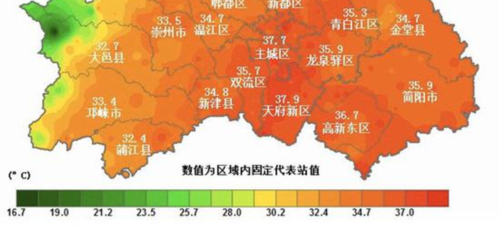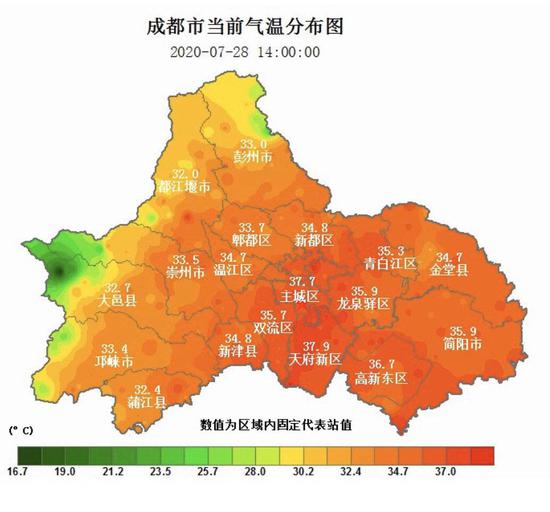 来看看实时气温,东西两边“鸳鸯锅”的模式也和明显。28日14时,成都东边各区市县基本都上了35℃,而西边各区市县气温还在三十二三度。最热的是天府新区,达到了37.9℃,而最凉快的都江堰,才32℃,相差了5.9℃。