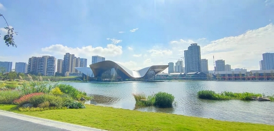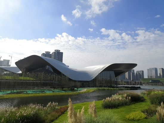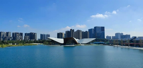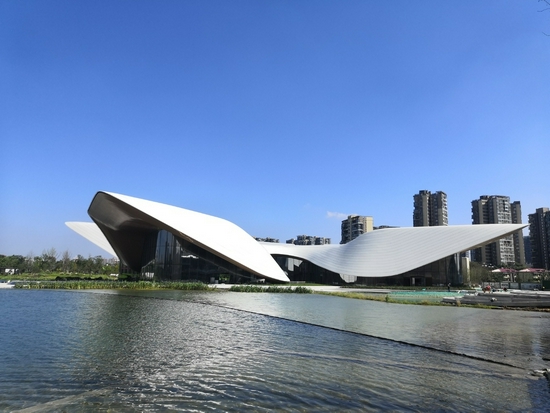 9月29日上午,成都市金牛区,正在建设中的天府文化艺术公园内,迎桂湖湖畔,一座“出水芙蓉”——天府文化艺术公园美术馆已披上华美“外衣”,五片巨型花瓣在蓝天和湖水的交相辉映下,熠熠生辉。