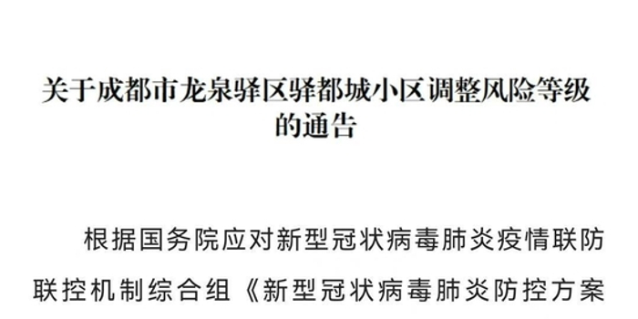 关注红星新闻记者今日(24日)从龙泉驿区获悉,刚刚,成都市龙泉驿区新型冠状病毒肺炎疫情防控指挥部发布关于成都市龙泉驿区驿都城小区调整风险等级的通告,龙泉驿区驿都城小区二期7栋(含底商)风险等级调整为中风险。