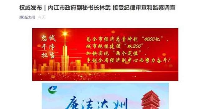 11月9日,中共达州市纪委、达州市监察委员会官微发布消息:内江市政府副秘书长林武涉嫌严重违纪违法,目前正接受纪律审查和监察调查。