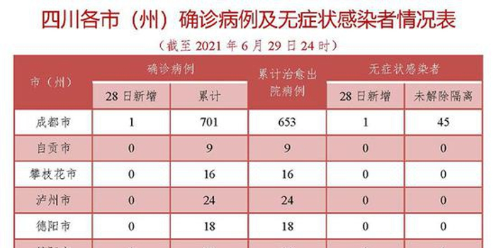 关注6月29日0-24时,四川新增新型冠状病毒肺炎确诊病例1例(境外输入,为6月28日无症状感染者转确诊),新增治愈出院病例1例,无新增疑似病例,无新增死亡病例。