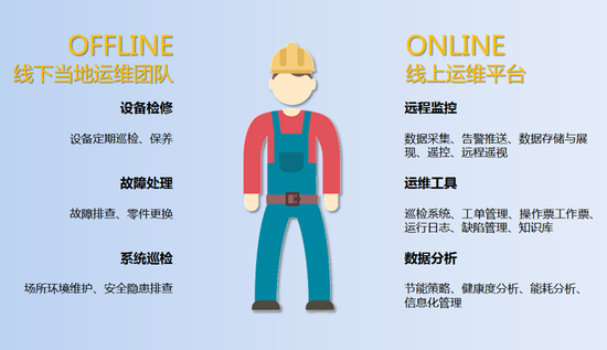 云电科技的主要业务是云集控电站运维托管服务,作为云集控电站管理平台化公司的先驱,运用自行研发YDEPOWER、UVIEW、UDCAP、UCOMM等多项技术实现电站远程集中控制、统一信息化管理、电站运行状态的远程监视。实现海量数据存储、提供数据接口,方便历史数据查询,为今后智能诊断、分析打下基础,也利于对接其它需要数据的系统接入,适应未来信息化、智能化的更高需求。在安全生产、节能增效、优化运行提供全方位的指导,并设立区域维保队伍,负责对区域电站群的巡检、缺陷处理,线上、线下分工明确。具体说明见下图: