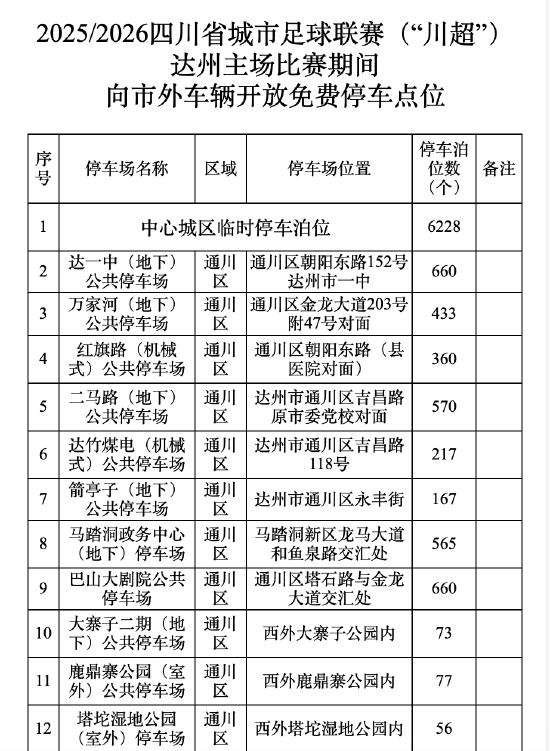 根据达州出台的赛事配套政策,市外牌照私家车在5个达州主场比赛的“当天及前后一天”,可享受中心城区指定停车场免费停放服务。结合最新赛程,达州主场赛事分别为10月2日(对阵成都)、10月19日(对阵遂宁)、10月26日(对阵广安)、11月8日(对阵南充)、11月15日(对阵巴中),全部在达州市体育中心举行。