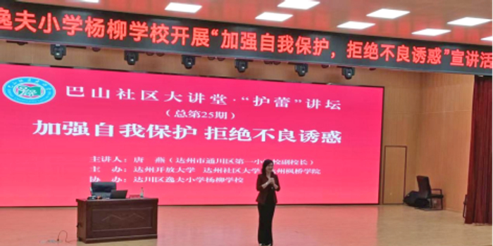 关注10月14日上午,达川区逸夫小学杨柳学校4楼会议大厅不时传出阵阵掌声与欢笑声,一场别开生面的“巴山社区大讲堂”护蕾讲坛主题讲座在此热烈举行。讲座由达州开放大学(达州社区学院 达州枫桥学院)主办,以“加强自我保护,拒绝不良诱惑”为主题,特邀达州市通川区第一小学副校长唐燕担任主讲,旨在引导小学生识别身边安全隐患,勇敢对不良诱惑说“不”,为孩子们的健康成长注入坚实的“心灵免疫力”。