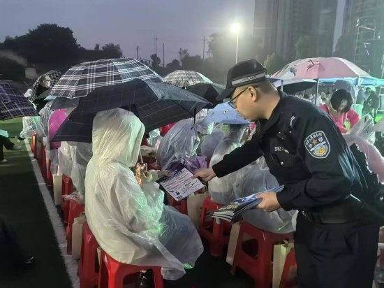 雨水虽浸湿了部分宣传资料,却浇不灭民警的宣传热情,更挡不住群众学习防骗知识的积极性。“下雨天民警还坚持宣传,讲得又详细,我们听得心里暖烘烘的!”家住附近的张阿姨一边认真翻阅资料,一边向民警询问细节,确保在观看演出前先筑牢“少上当、不被骗”的思想防线。