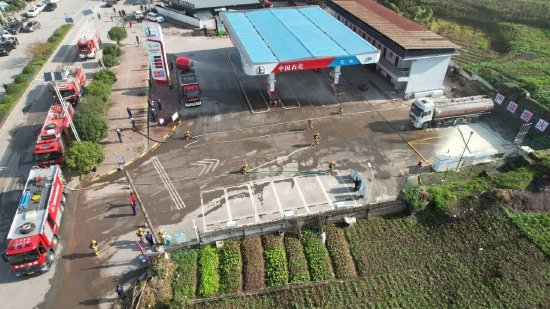 演练模拟油品泄漏引发闪燃事故的情景。在中国石化四川达州石油净化厂加能站卸油过程中,卸油软管发生泄漏,现场人员在关闭阀门时因静电火花引发地面流淌火。站长立即启动应急预案,切断电源;通信联络组迅速报警并上报;警戒疏散组有序组织人员撤离,并在入站口引导救援力量。