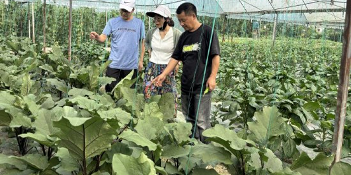 “三区”科技人才、省农科院研究员刘独臣(中)察看引进的高产优质茄子。