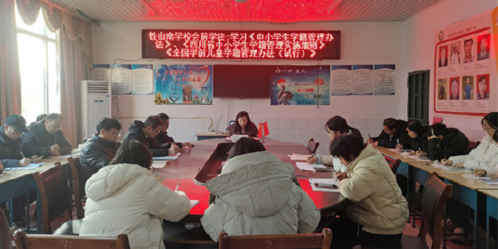 作为学籍管理的直接实施者,该校首先聚焦教师队伍能力提升,1月12日召开全体教师会议,通过会前学法方式集体学习《中小学生学籍管理办法》《四川省中小学生学籍管理实施细则》及《全国学前儿童学籍管理办法(试行)》三大核心文件,重点围绕学籍建立、信息更新、异动办理、档案保管等关键环节展开深入研讨。针对学校学生流动特点,特别强调了“一人一籍、籍随人走”“学籍号终身不变”等核心原则,结合转学、缓学、休学、复学等实际案例,详解业务办理流程与材料规范,明确学籍信息采集“真实、准确、完整”的底线要求。老师们认真记录、积极提问,就日常管理中遇到的疑难问题展开集体研判,有效提升了学籍管理的规范化、科学化水平,为后续工作开展筑牢专业根基。
