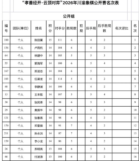 此次公开赛以棋为媒,不仅丰富了群众文旅生活,更搭建了川渝两地文化交流的桥梁,进一步激活了区域传统文体活力,助力孝善文化与体育赛事深度融合,期待下一次山水之约,再续川渝棋缘、共赏棋艺风华。(杨涛)