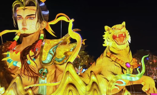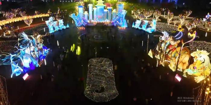 当晚19时,点灯仪式如期举行。以“龙马精神”主门楼为起点,五大主题区域约百组大型灯组次第点亮,灯光流转间,汉阙的庄重、神女的飘逸与市井的温情徐徐铺展。无人机编队凌空而起,先后勾勒出活动主题字样、巴小虎形象及“盐水女神”“战神廪君”等巴賨文化符号,将古老文化的厚重与浪漫演绎得淋漓尽致。