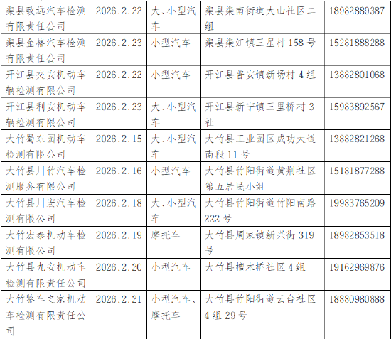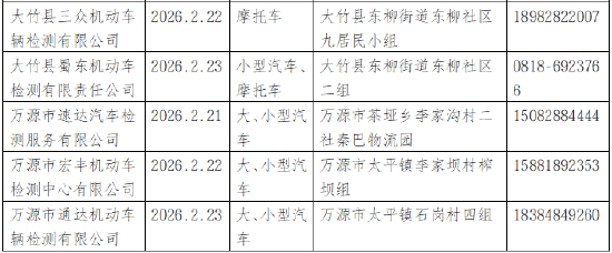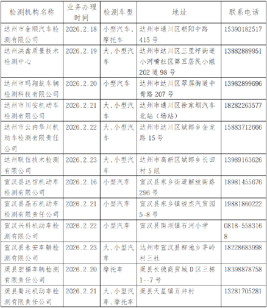 针对机动车检测业务,公安部门明确,全市机动车检测服务网点所有业务将于2026年2月24日全面恢复正常办理。春节假期期间,群众若有交管业务相关疑问,可拨打值班民警电话18982875321咨询,值班人员将及时回应群众诉求、解答办事疑问,引导群众合理安排办事时间。(杨涛 综合/达州公安)
