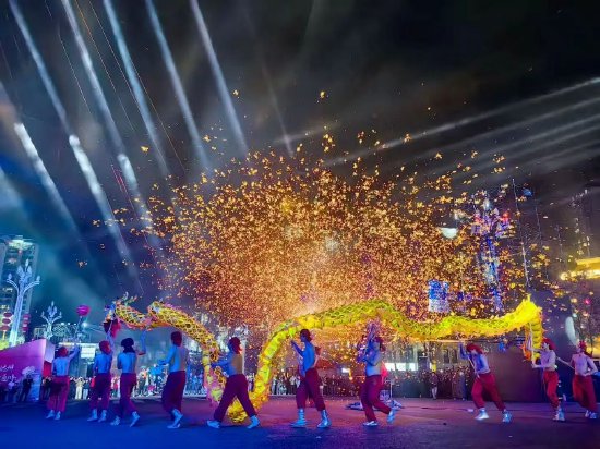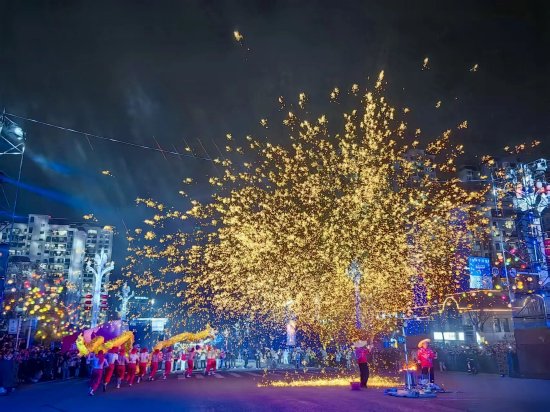 舞火龙、打铁花与火壶表演三项非遗绝活压轴登场,将现场气氛推向顶峰。火龙翻腾映亮夜空,打铁花绽放漫天星火,娴熟的技艺引得市民纷纷用手机记录这一震撼瞬间,滚烫火花不仅点亮了新春夜空,更温暖了整座城市的节庆氛围。演出最后,演员们分散全场谢幕,在温情氛围中圆满落幕。