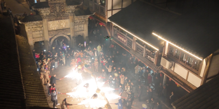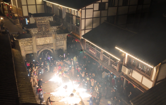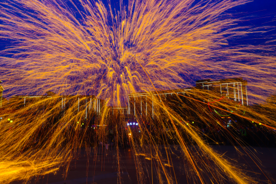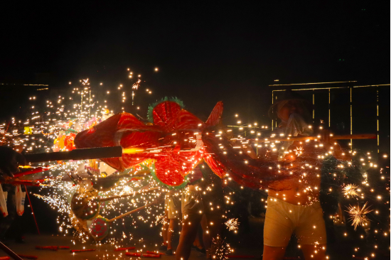 据悉,火龙以竹篾、麻布、彩纸扎制而成,全长十余米,每条龙由8至10名赤膊青壮男子执掌,伴随锣鼓声蜿蜒翻腾,上演“翻江倒海”“跃龙门”等经典招式。1600℃铁水腾空泼洒,化作漫天星雨,搭配民众燃放的烟花,火树银花映亮古镇夜空,将勇敢强悍的民俗精神与对新年的美好祈愿融入其中。