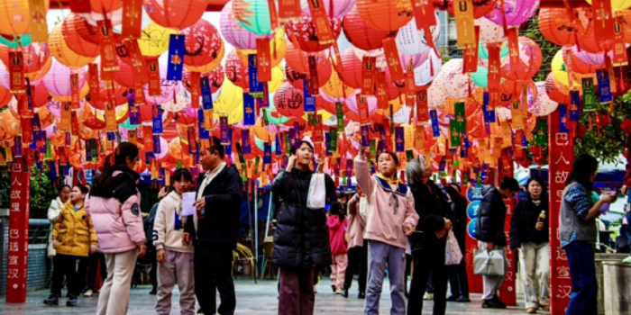 广场上,1500盏火红的灯笼在春风中摇曳,灯谜纸条随风轻摆,现场洋溢着浓厚的节日气氛。市民们三五成群,争相猜谜兑奖。