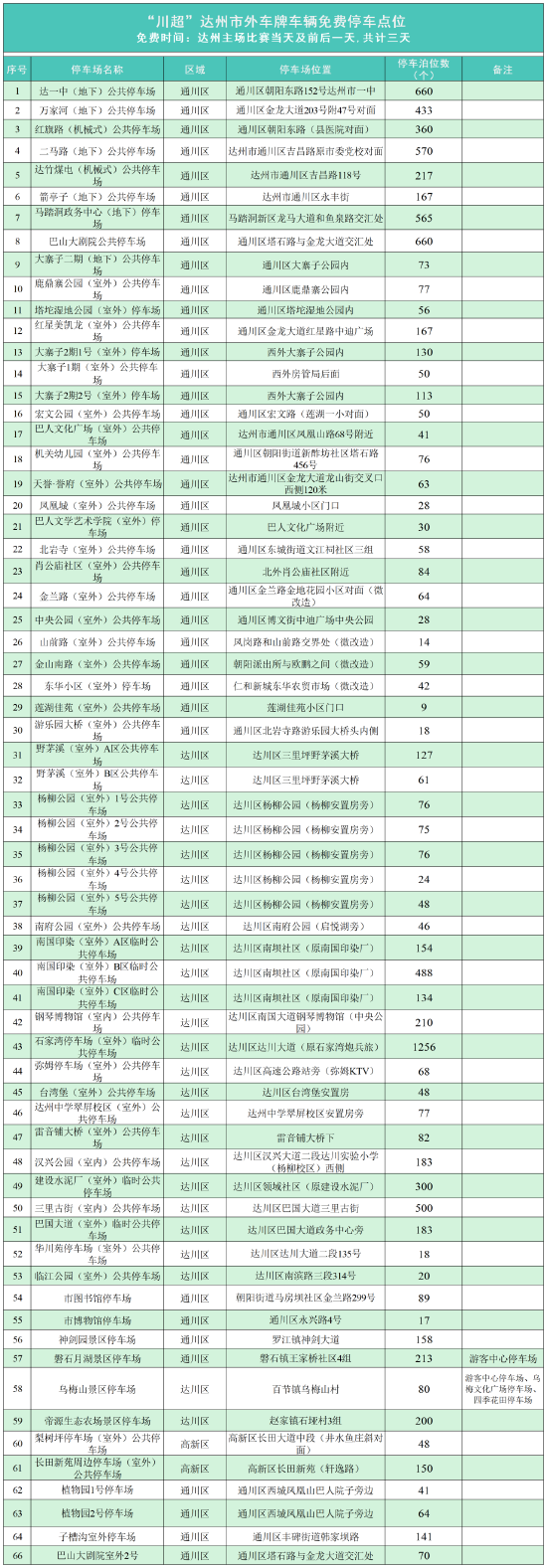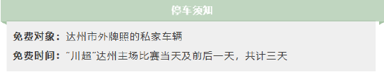 据悉,免费停车对象为达州市外牌照的私家车辆,免费时间为每一场川超达州主场比赛当天及前后一天,共计三天。