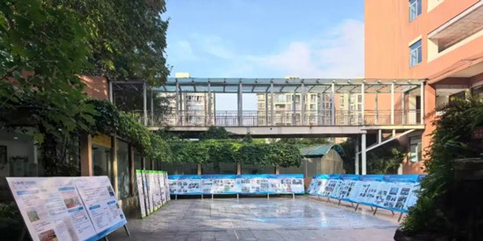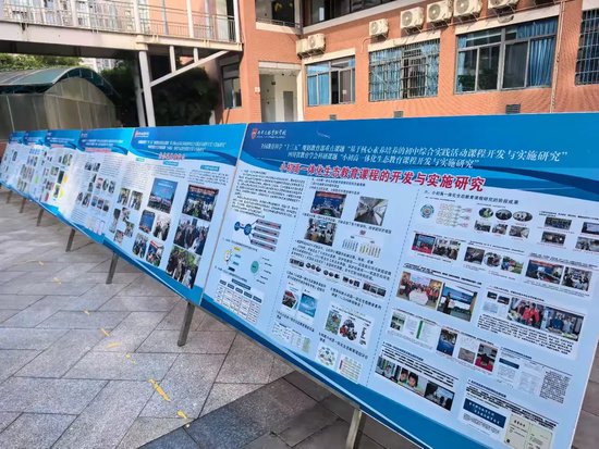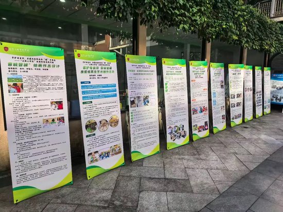 调研团队首先参观了学校室外的“一河一校”工作成果展示区。通过展板系统呈现了学校在河湖保护教育、学生实践活动等方面的内容。开阔区域的展示板与校园建筑物相呼应,形成了直观的宣传教育场景。