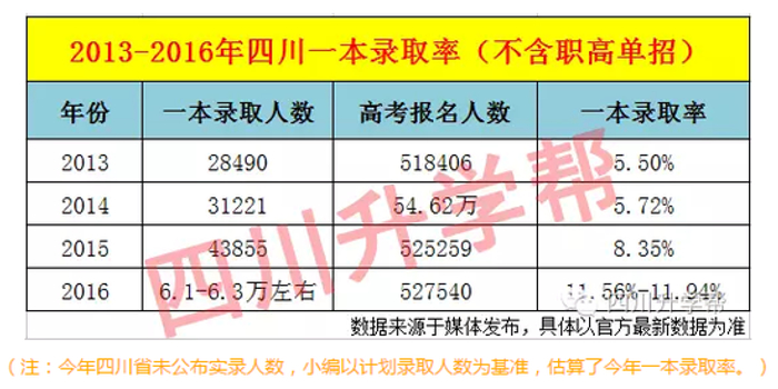 从上表,我们发现虽然2013年至2016年的四年时间,四川高考一本率逐年攀升,从2013和2014年的5%左右到今年的11%以上,翻倍增长。